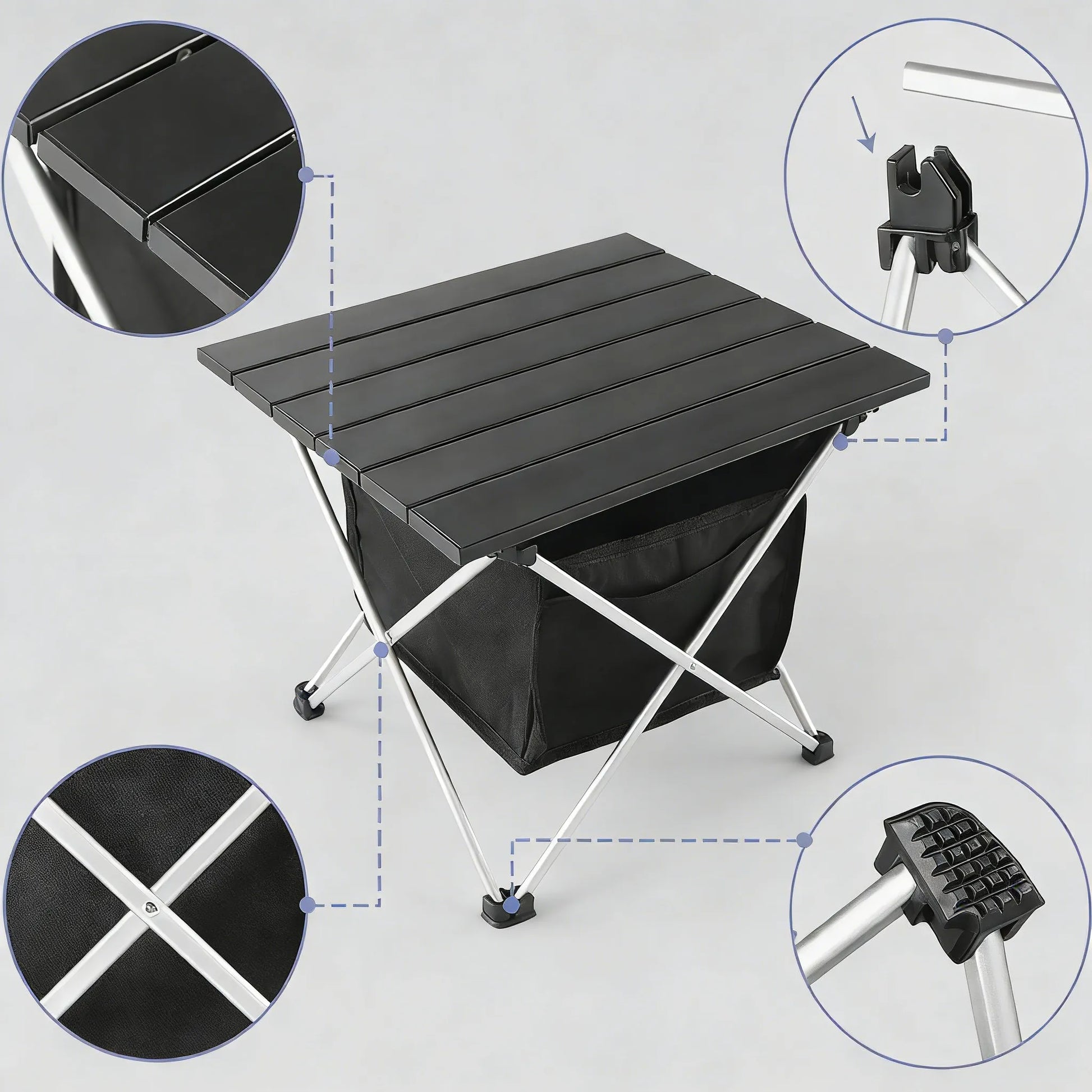 Durable Construction ---- Our foldable camping table is crafted from heavy-duty aluminum. With its stable foot cap, the legs are designed to resist folding, bending, or falling off. This makes it suitable for use on various terrains without the risk of tipping over. The triangular frame and strong joints allow the table to support up to 55 pounds. You can use this table with confidence for activities like picnics or cooking.