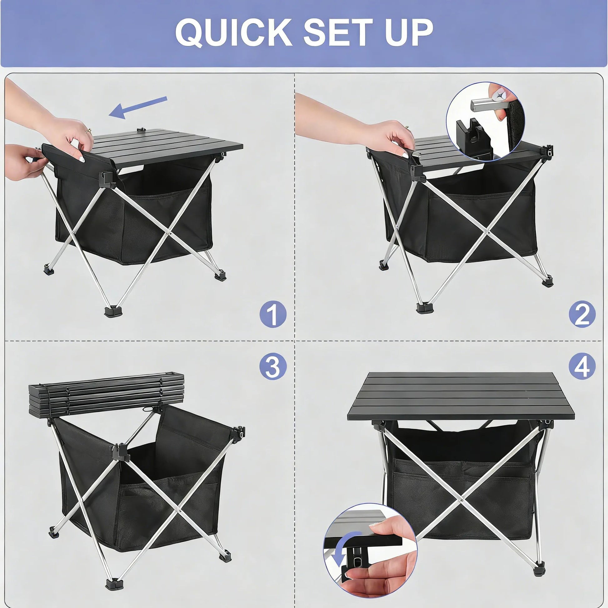 Easy Setup & Sizes ---- Setting up the foldable picnic table is quick and easy, with no tools required. The unique hinge design allows you to open and fold this compact outdoor camping table in seconds. Our tables come in three sizes: Small / Medium / Large. The Small table measures 15.6 × 13.6 × 13 inches, the Medium table is 22 × 16 × 16 inches, and the Large table measures 27 × 18 × 16 inches.